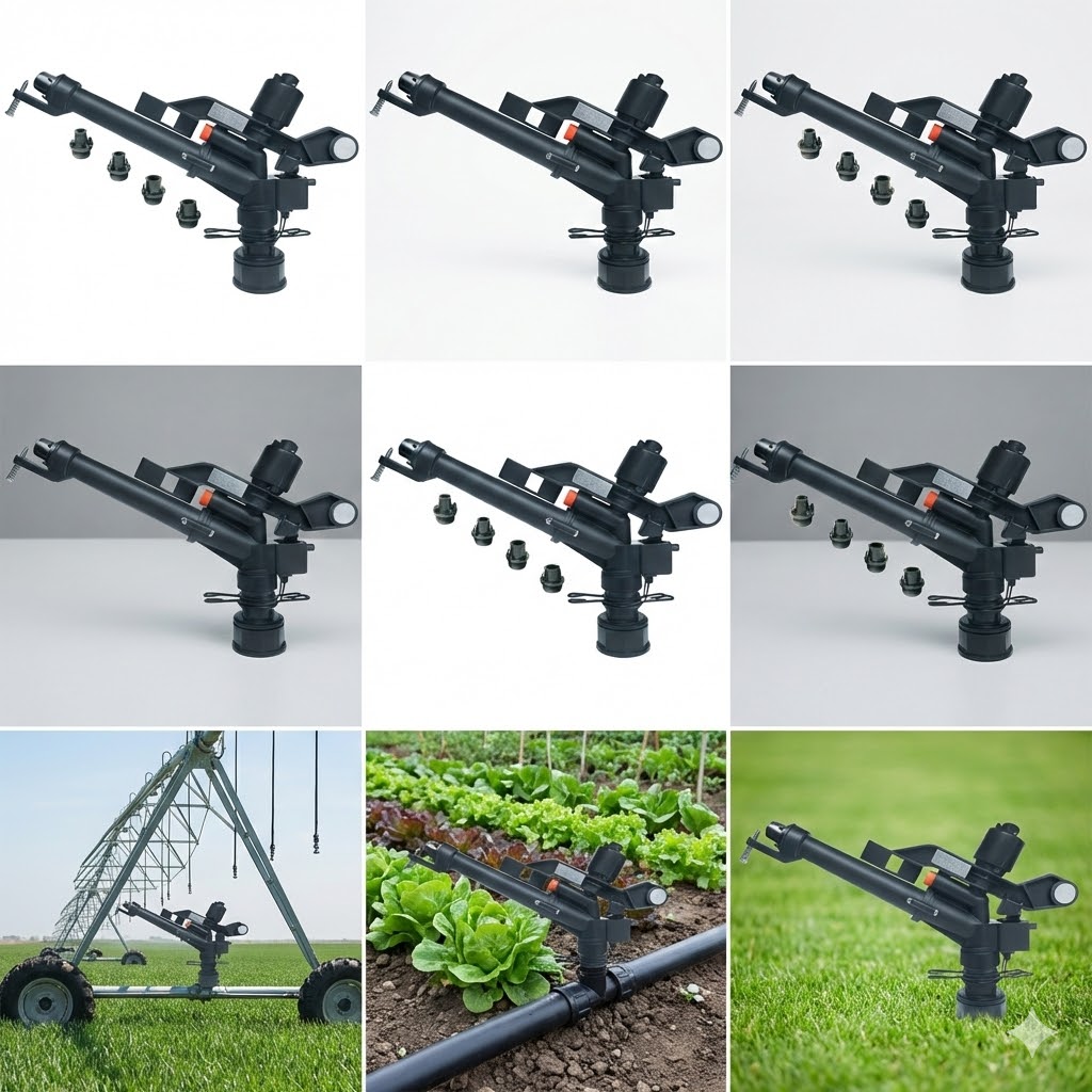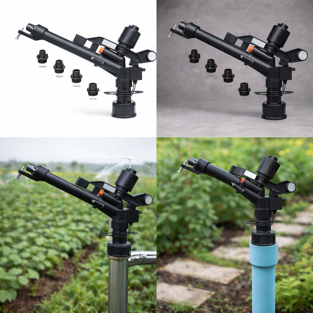 Sản phẩm đi kèm với bộ 4 họng phun (nozzles) kích thước khác nhau (10mm, 12mm, 14mm, 16mm), cho phép chủ vườn tùy biến hoàn toàn lưu lượng và bán kính tưới tùy theo công suất máy bơm và nhu cầu của từng loại cây trồng.