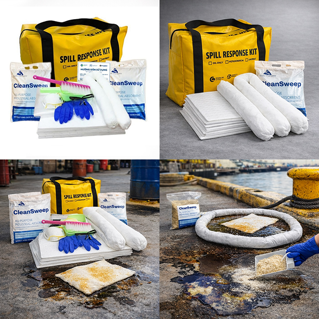 - Kiểm soát tràn đổ (Spill Control): Sử dụng tấm thấm và bột thấm để cô lập hoàn toàn lượng dầu vãi trên bề mặt.